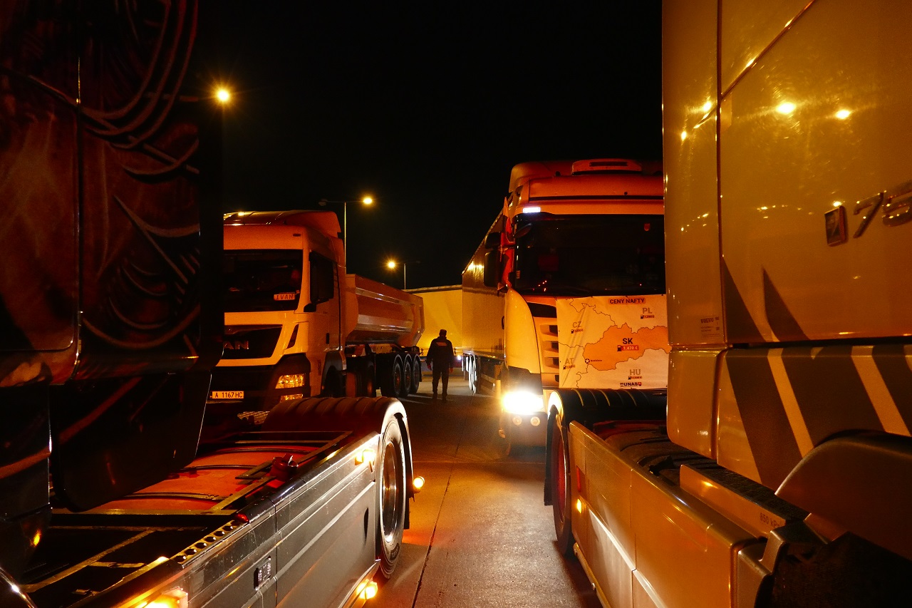Protestujúci dopravcovia sa z Bratislavy presunuli k hraničnému priechodu Kúty, kde v utorok večer blokovali výjazd z parkoviska.