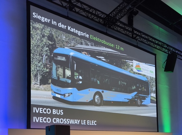 Potom, čo odborný časopis Busplaner v roku 2021 ocenil modely CROSSWAY a CROSSWAY Low Entry Natural Power a v roku 2024 model E-WAY H2, udelil teraz cenu „International Sustainability Award 2026“ modelu CROSSWAY Low Entry ELEC. Táto cena, ktorá sa udeľuje každé dva roky od roku 2013, oceňuje spoločnosti, ktoré úspešne spájajú ekonomický výkon, sociálnu zodpovednosť a ochranu životného prostredia. Cenu prevzal Yves Naxa, Business Director IVECO BUS – IVECO Deutschland AG.