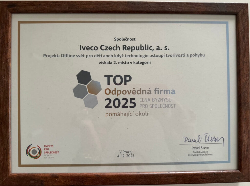 Spoločnosť Iveco Czech Republic, a.s. získala dvojité ocenenie v prestížnej súťaži TOP Zodpovedná firma 2025, ktorú organizuje aliancia Biznis pre spoločnosť.