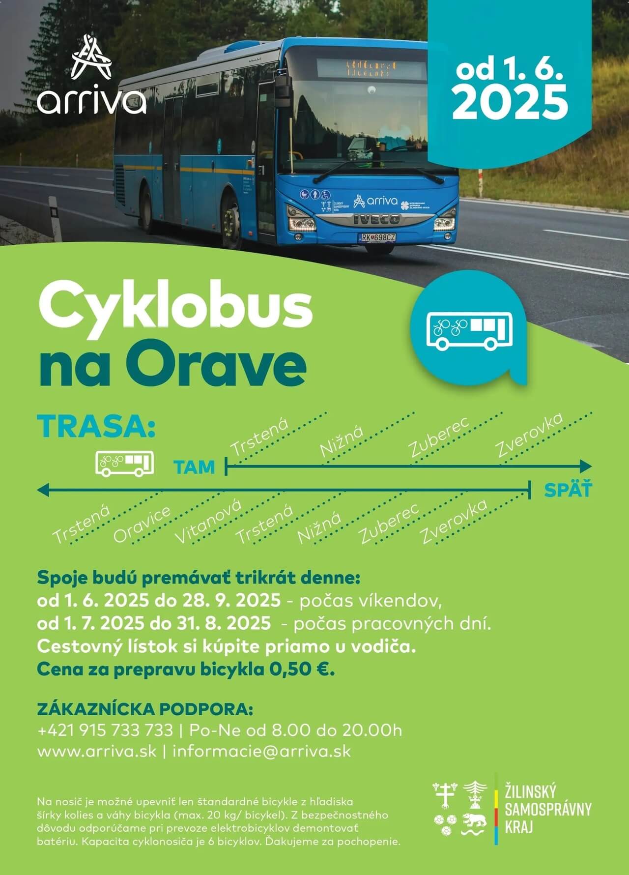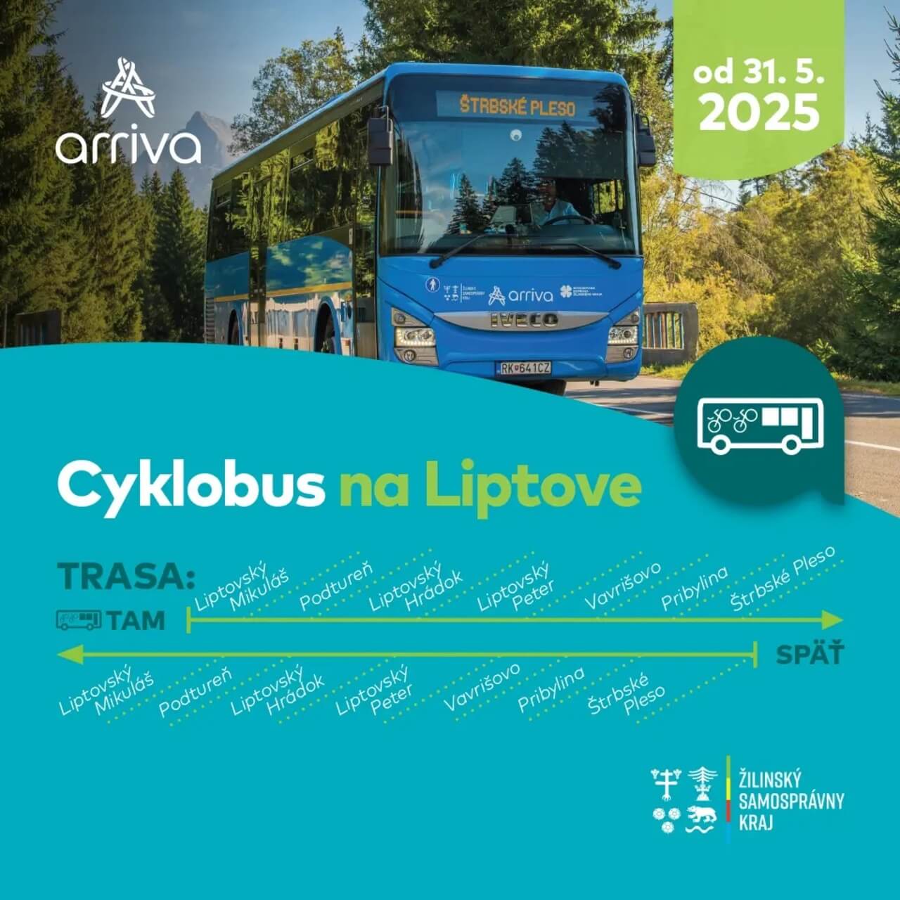 Aj v tomto roku odštartovala ARRIVA obľúbené cyklobusy v Nitrianskom, Trnavskom, Žilinskom a od konca júna aj Košickom kraji. Cestujúci ich môžu využívať na výlety do prírody či za kultúrou v okolí Piešťan, Senice, Trnavy, Nitry, Zlatých Moraviec, ale aj na Orave, Liptove či Zemplíne. Službu, ktorá si získava stále väčšiu popularitu, zabezpečuje spoločnosť ARRIVA v spolupráci so samosprávnymi krajmi ako objednávateľmi verejnej dopravy.