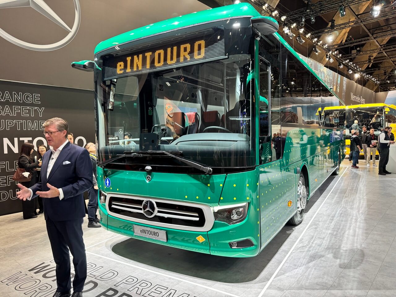 Daimler Buses priviezol jedinú novinku, a to finálnu verziu elektrického medzimestského autobusu Mercedes-Benz eIntouro. Ponúkaný je v dvoch dĺžkach (12,18 m a 13,09 m) s motorom ZF CeTrax 2 dual s 320 kW. O energiu sa starajú LFP batérie s 207 alebo 414 kWh, umožňujúce dojazd až 500 km. Nabíjanie prebieha až výkonom 400 kW. Okrem toho Mercedes-Benz ukázal aj eCitaro s novou batériou NMC4, ktorá má o 13 % vyššiu energetickú hustotu ako predchádzajúca generácia (až 666 kWh pre sólo, resp. 777 kWh pre kĺbovú verziu) aj dlhšiu životnosť (až 15 rokov) aj pri častom rýchlonabíjaní. Prinášajú dojazd až 600 km.