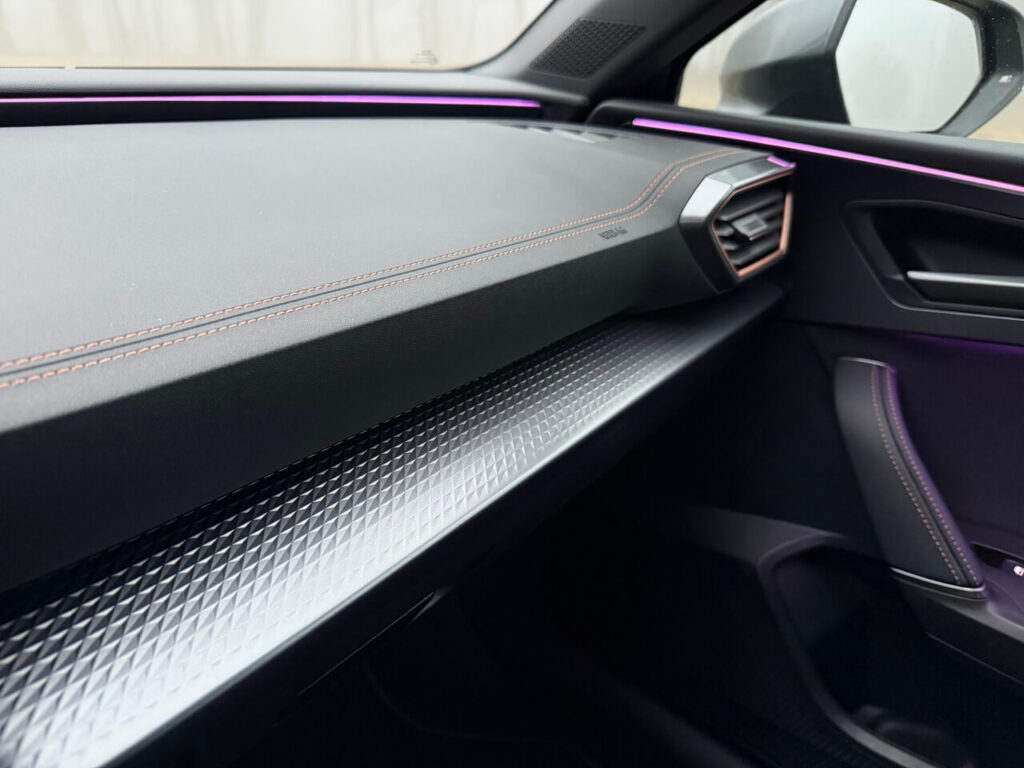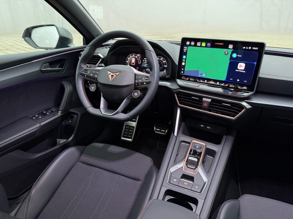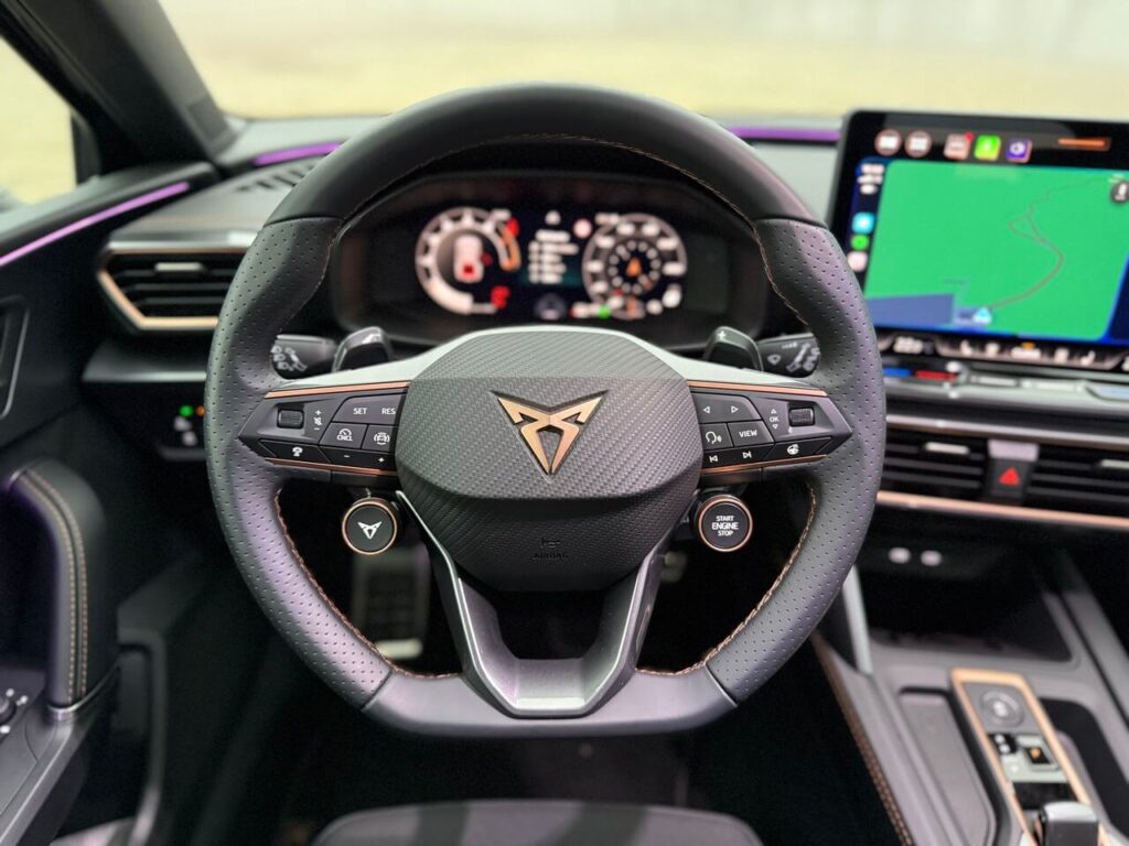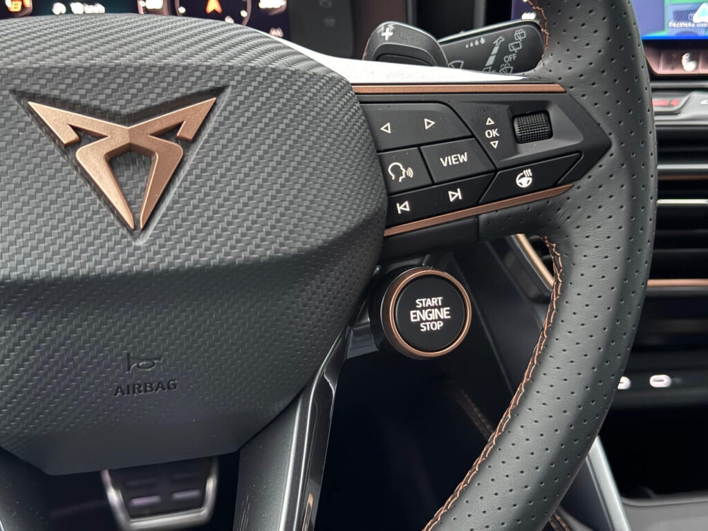 Športové predné sedadlá poskytujú lepšie bočné vedenie a majú bedrovú opierku. Poťahy s dizajnom Cupra pôsobia pevnejšie. Kožený volant s radiacimi páčkami, vyhrievaním a fyzickými tlačidlami má prirodzený odpor.