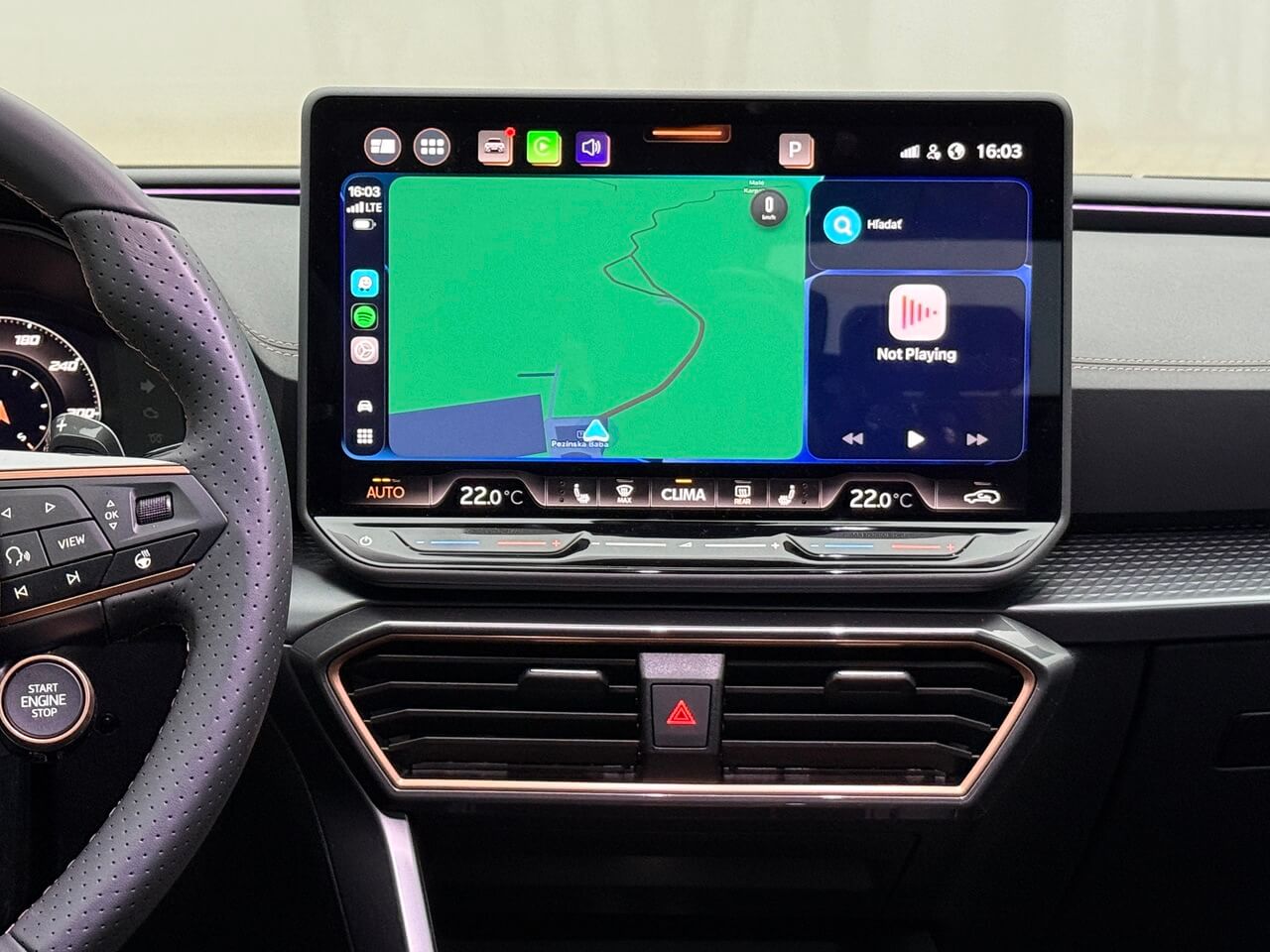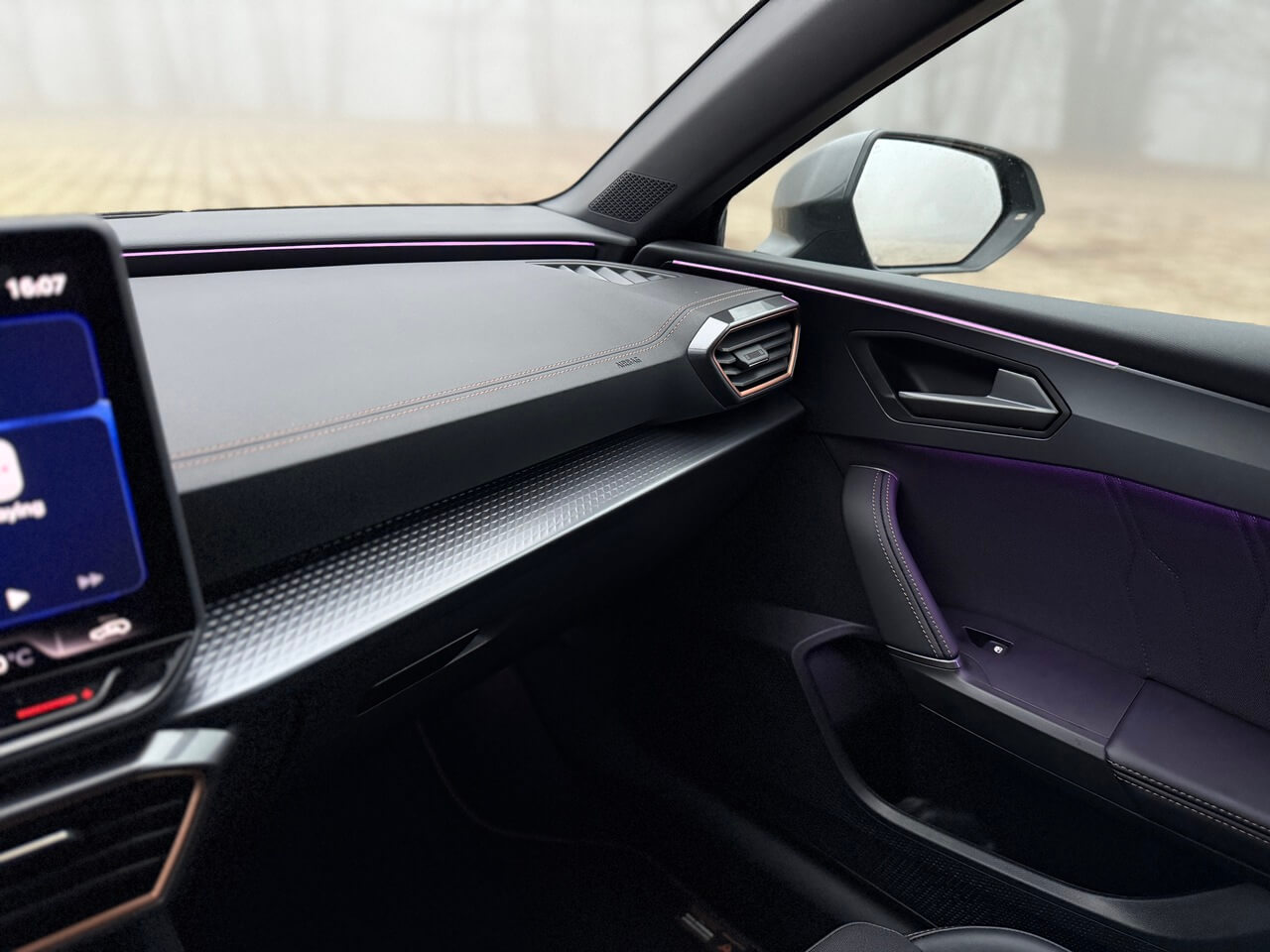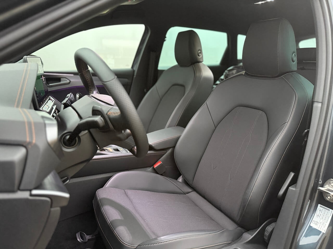 Športové predné sedadlá poskytujú lepšie bočné vedenie a majú bedrovú opierku. Poťahy s dizajnom Cupra pôsobia pevnejšie. Kožený volant s radiacimi páčkami, vyhrievaním a fyzickými tlačidlami má prirodzený odpor.