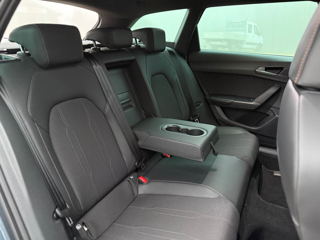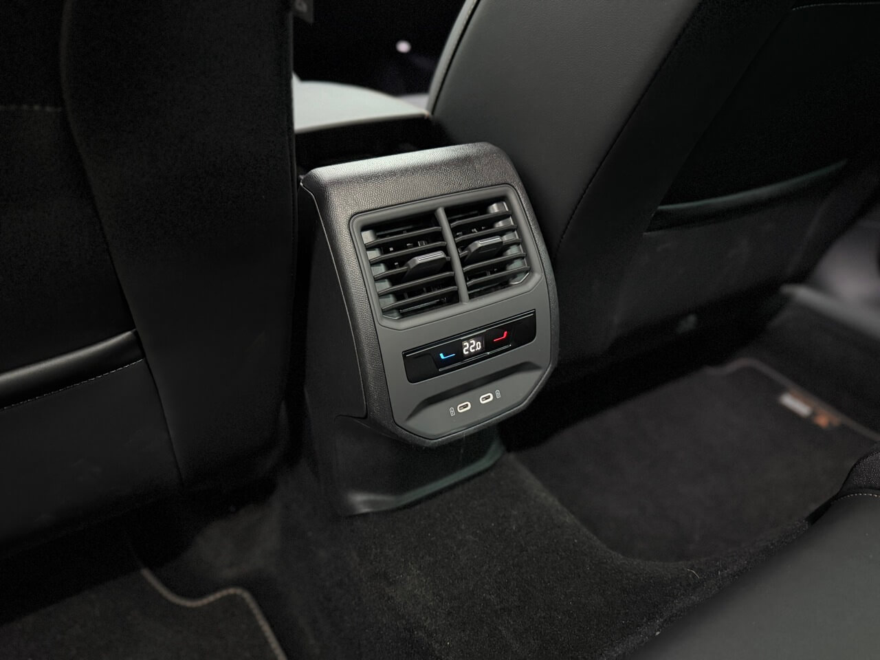 Vzadu zostáva dostatok priestoru pre dve dospelé osoby. Výduchy klimatizácie, USB-C konektory a vrecká na operadlách zvyšujú praktickosť. Stredné operadlo je sklápateľné a obsahuje otvor na dlhšie predmety.