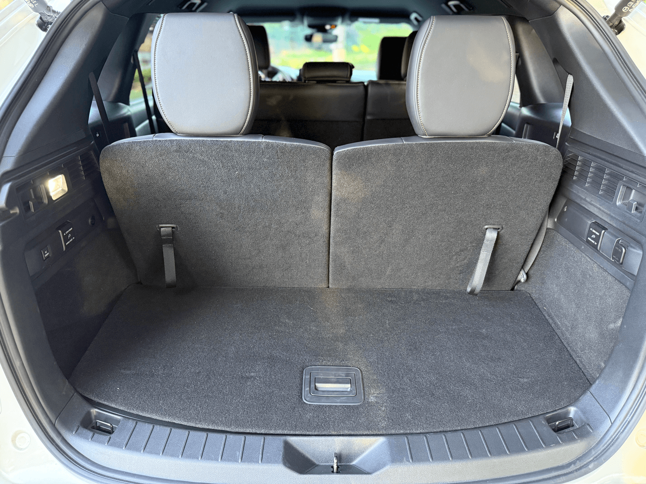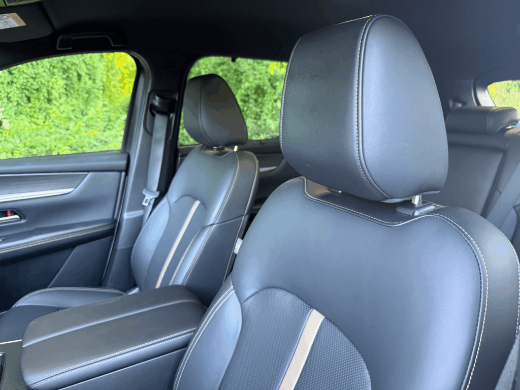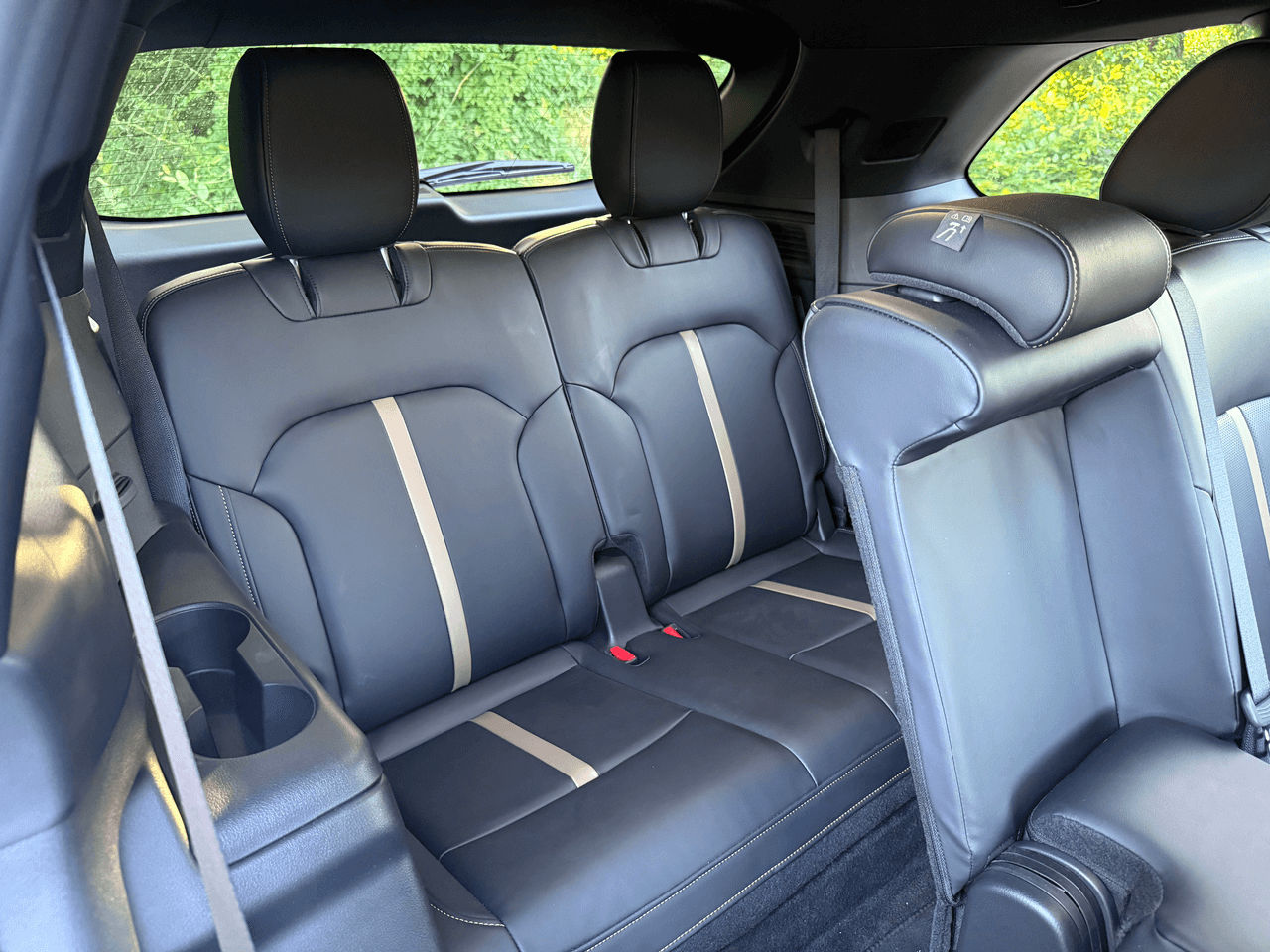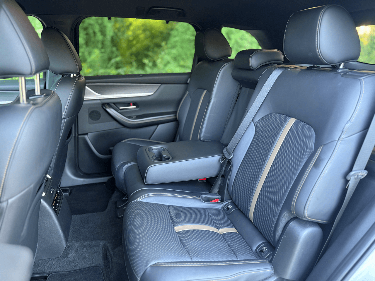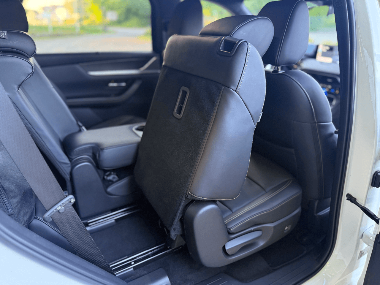 Predné sedadlá sú elektricky nastaviteľné s pamäťou, komfortné a ponúkajú dobré bočné vedenie. Druhý rad poskytuje dostatok priestoru aj pri posunutej prvej rade. Cestujúci tu majú USB-C porty a vlastné ovládanie trojzónovej klimatizácie. Za nimi sa nachádza tretí rad sedadiel, vhodný najmä pre deti alebo kratšie trasy dospelých. Vďaka elektrickému posuvu druhej rady je prístup jednoduchý a po sklopení vznikne úplne rovná ložná plocha – praktické riešenie na každodenné používanie.