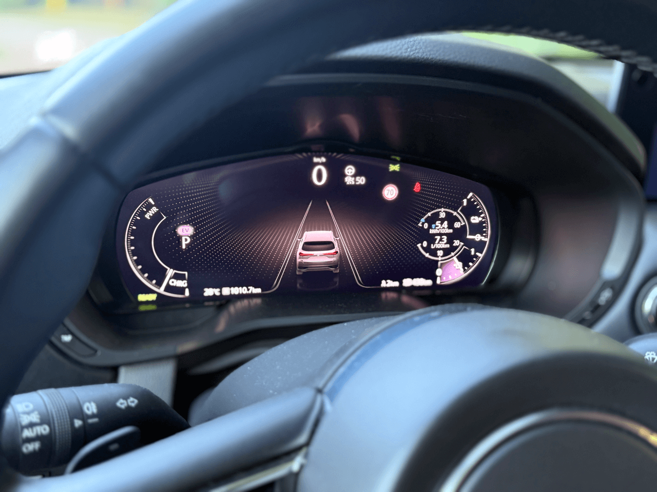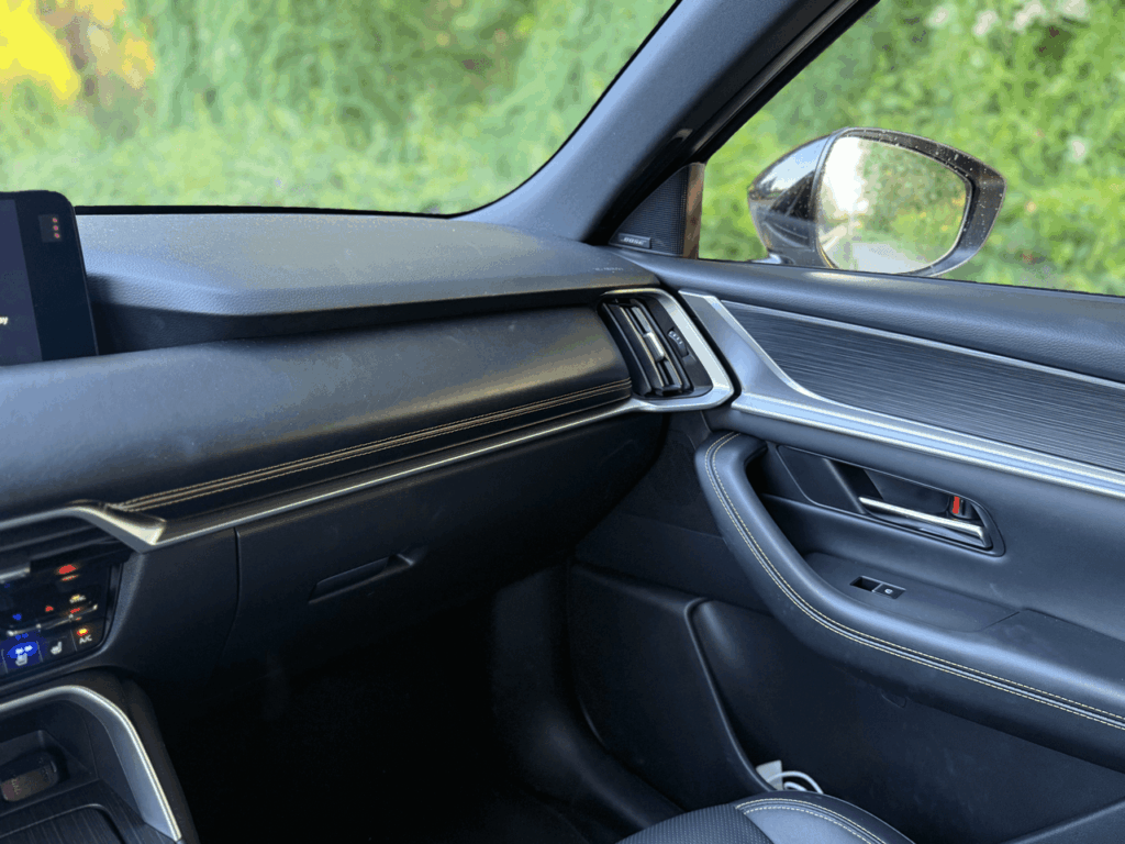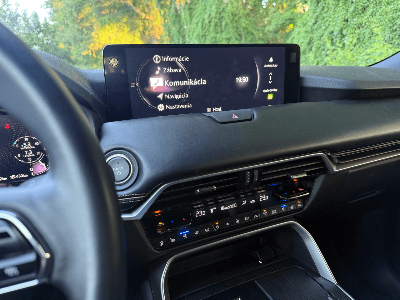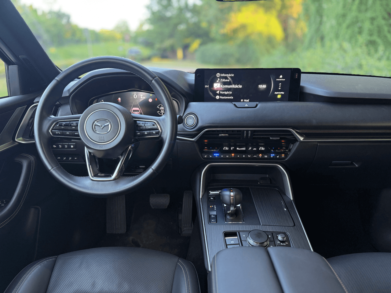 Už po otvorení dverí bolo zrejmé, že Mazda pri interiéri mieri vysoko. Palubná doska pôsobí elegantne a precízne, s dôrazom na remeselný detail. Kabína je svetlá, priestranná a vďaka mäkčeným obkladom, koži Nappa a kovovým akcentom pôsobí prémiovo. Stredová konzola je čalúnená aj v oblasti kolien, čo zvyšuje komfort.